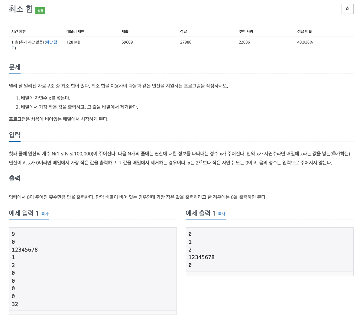 이 문제는 시간초과 조건이 포함되어있고, 배열에서 가장 작은 값을 찾으라고 하였기 때문에 힙을 쓰는 것이 좋다.